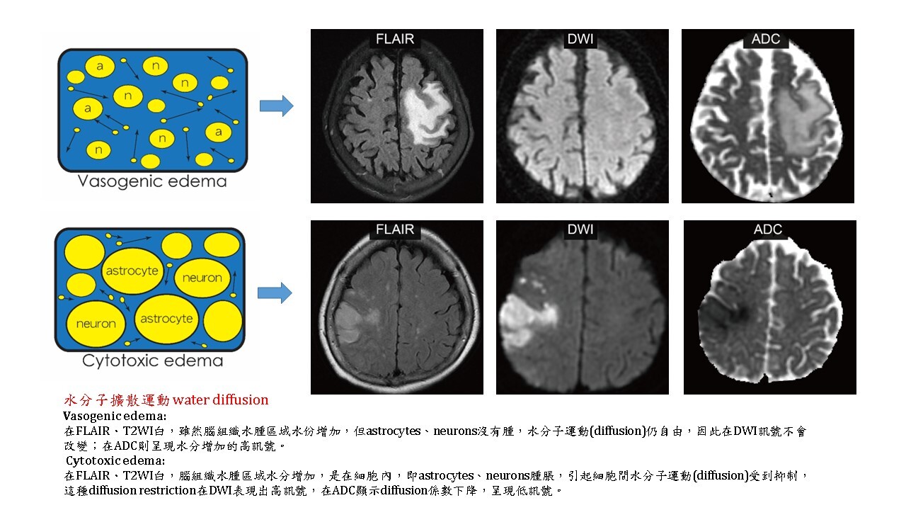 DWI最主要用於腦梗塞急性期時,腦組織細胞性水腫(cytotoxic edema),使腦組織之水分子布朗運動(Brownian motion of water molecules)受到妨礙,即水分子的擴散受到抑制 (diffusion restriction),在DWI下訊號很高,變得很白