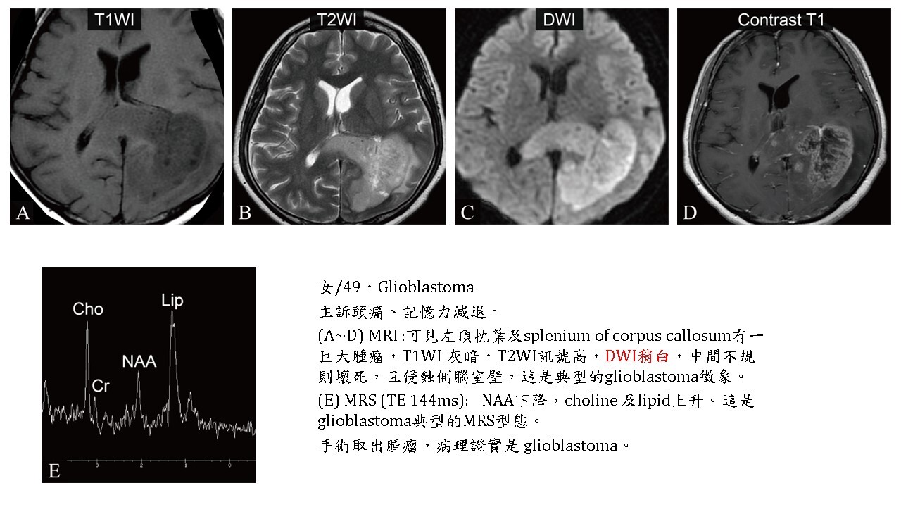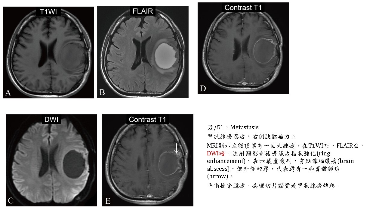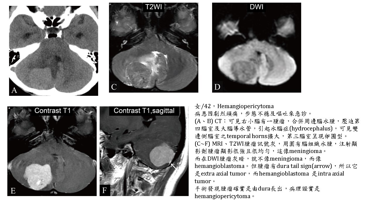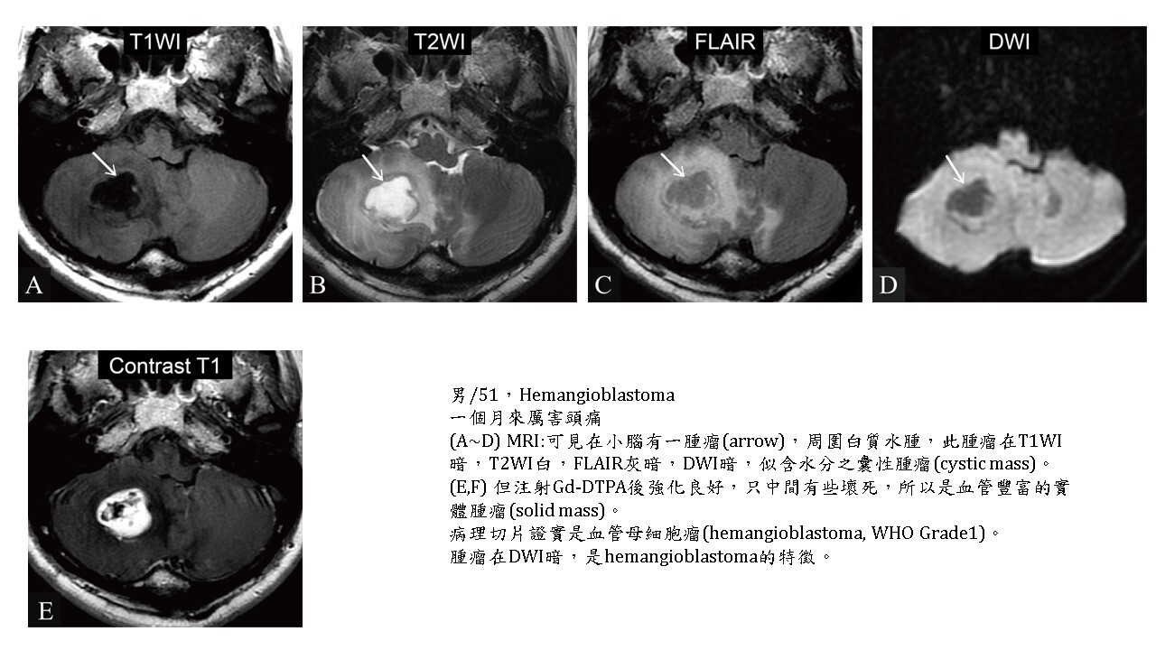 大多數的腫瘤(brain tumors)的實體部分(solid part),不管良性及惡性,DWI都會稍白,但對於血管豐富的hemangioblastoma, hemangiopericytoma則DWI暗。