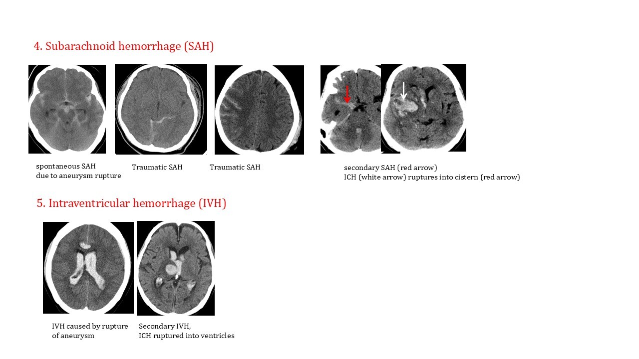 4. 蜘蛛網膜下腔出血Subarachnoid hemorrhage (SAH),因為不易形成血塊,所以叫hemorrhage,而不寫成subarachnoid hematoma。