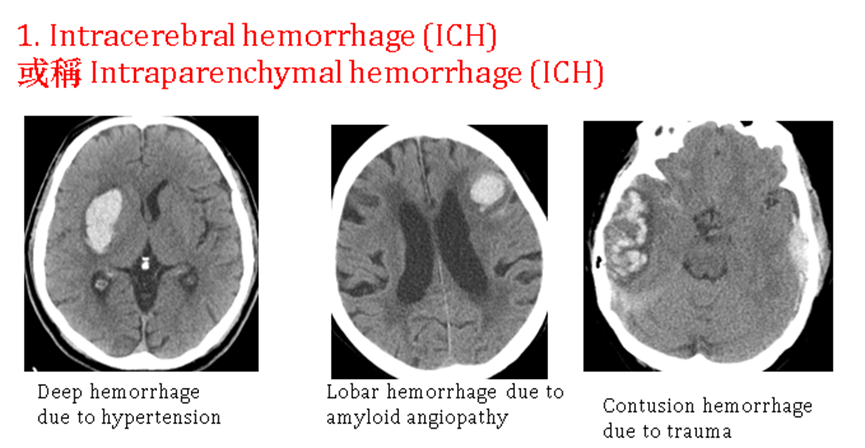 A. 深層出血(deep hemorrhage),即出血在基底核之putamen、caudate nucleus、thalamus,以及腦幹,主要原因是高血壓性中風。