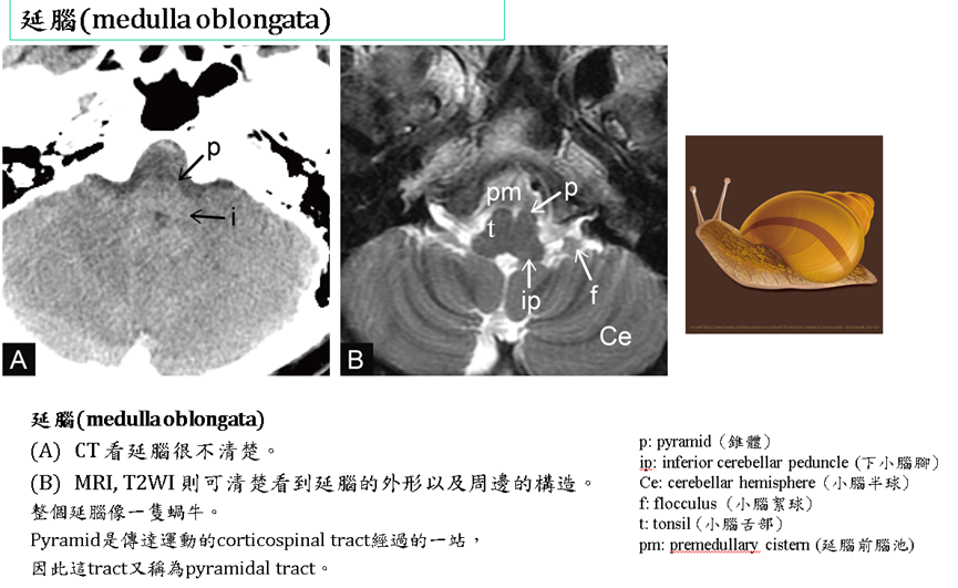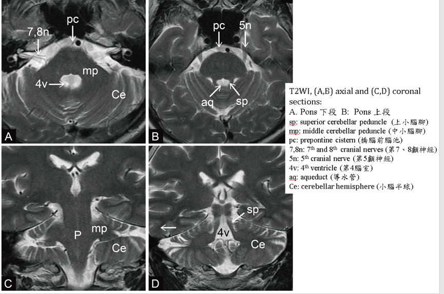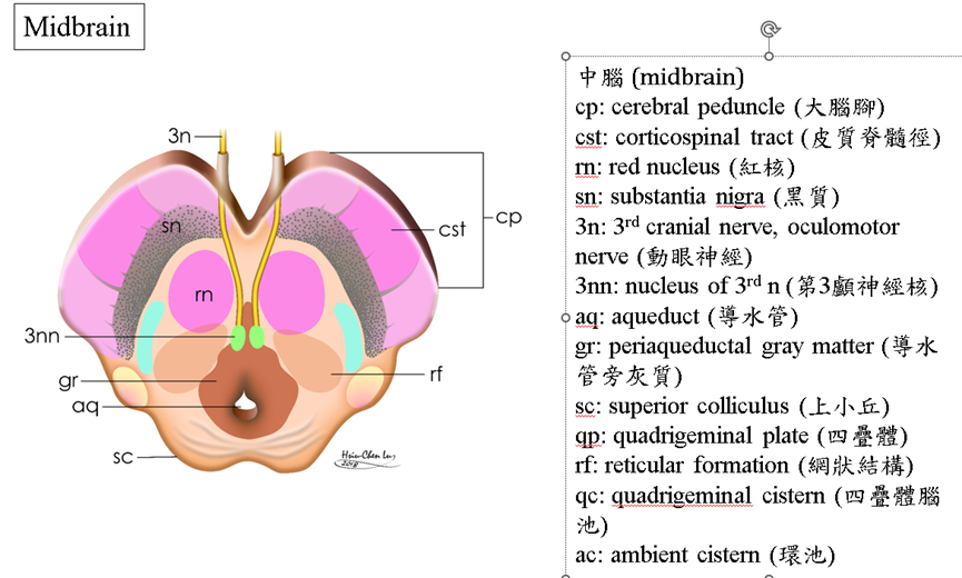 在MRI 的T2WI、FLAIR、SWI,可以看到中腦內的紅核(red nucleus)及黑質(substantia nigra),但對於腦幹內第3對顱神經的神經核以及諸多的神經束(tract),MRI 仍無法顯示出來
